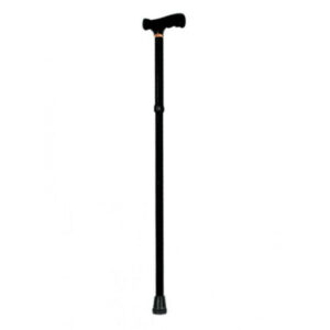 Bastone pieghevole con canna in alluminio regolabile in altezza, colore nero, impugnatura tipo “Derby” in legno. Puntale antiscivolo in gomma con rondella metallica interna. Corredato da una comoda custodia trasparente.
