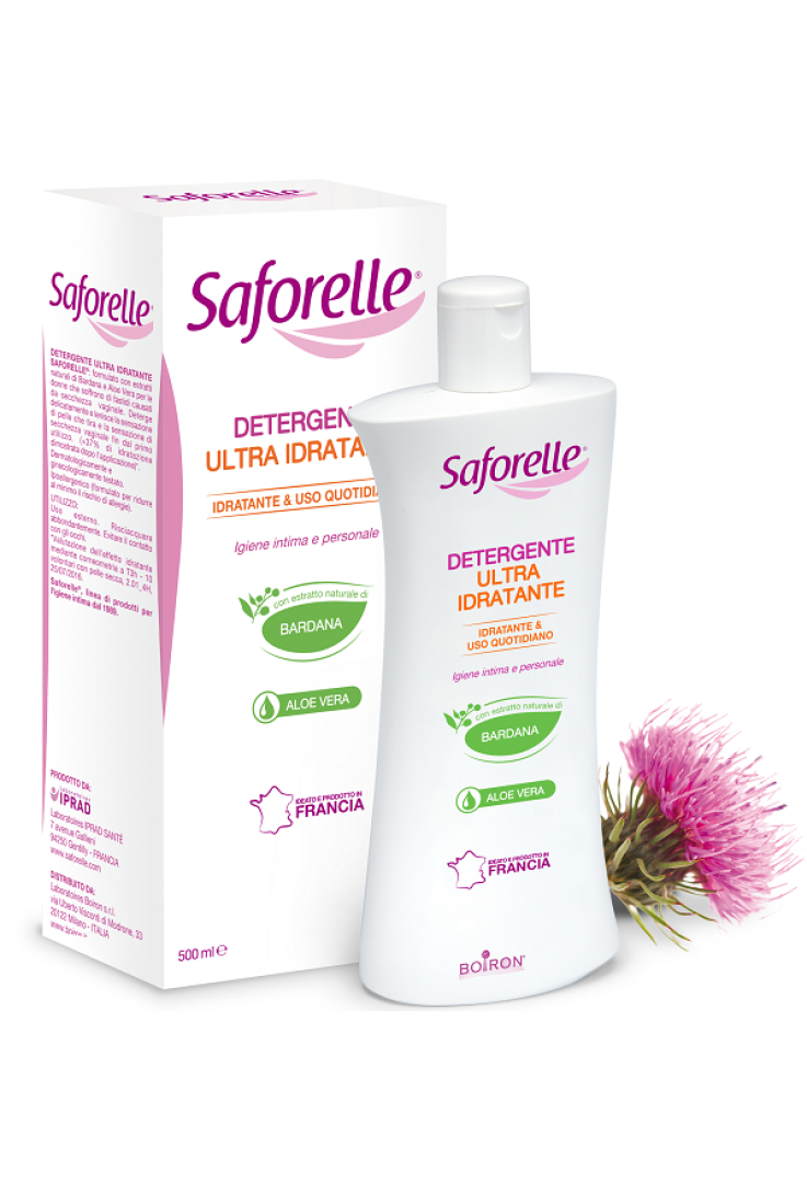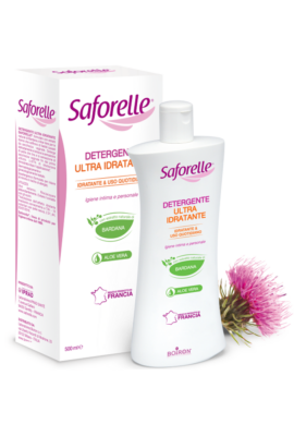 Saforelle Gel Detergente Ultra Idratante è formulato con estratti naturali di Bardana e Aloe vera per le donne che soffrono di fastidi causati da secchezza vaginale.